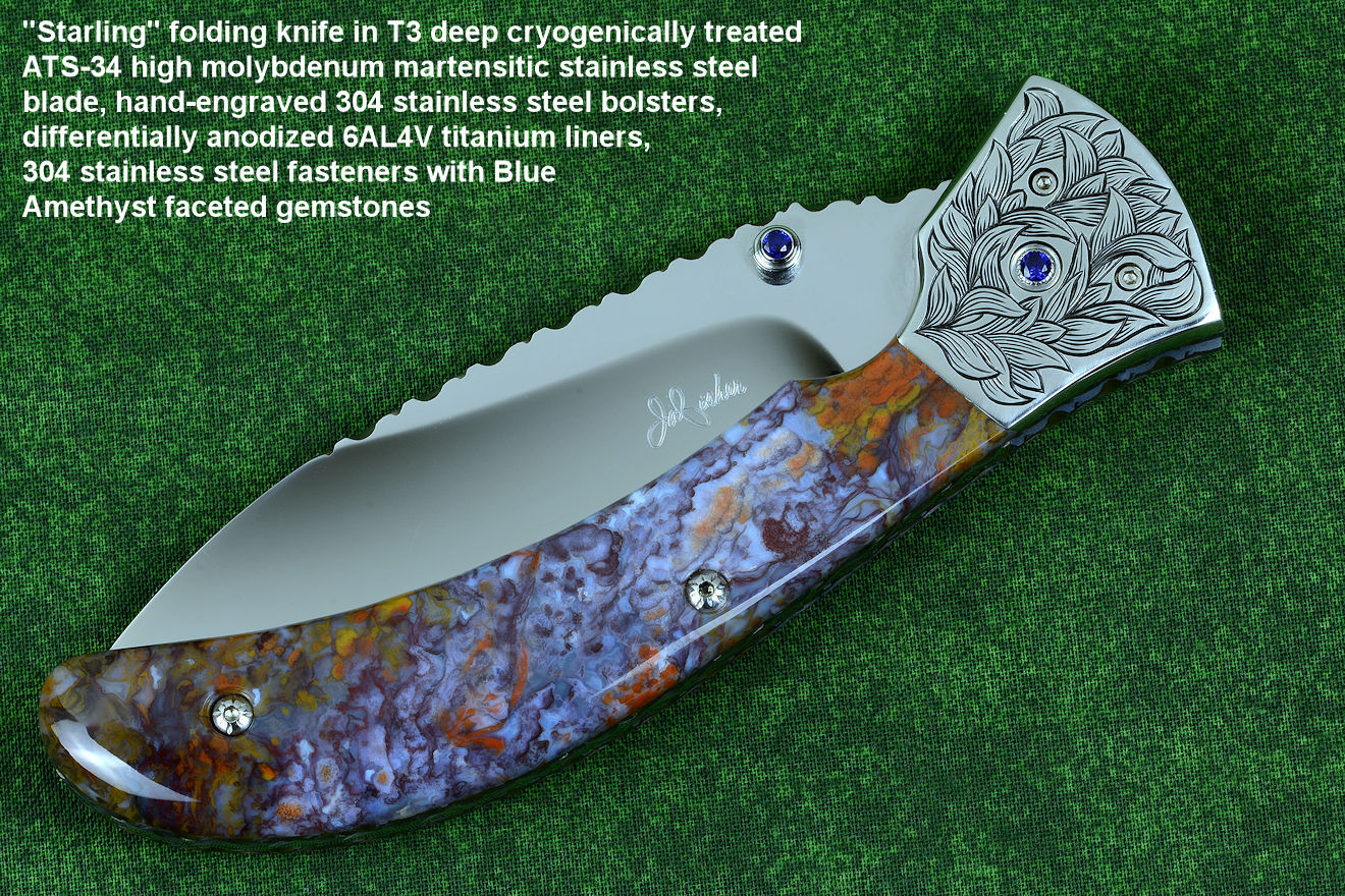 Since I make more gemstone handled knives than any other individual maker, you've probably guess that I make most of my folding knives with gemstone handles. I am not limited to gemstone though, and you'll see other handle materials on my folders. Materials used are just the start of any differences, and my patterns and styles are also unique. Embellishment like filework and engraving is usually enhancing the folding knife. The engraving that I apply is my own style, constantly evolving. Since I consider each folding knife an individual endeavor, the stand, case, or accoutrements are also unique and in my own style.