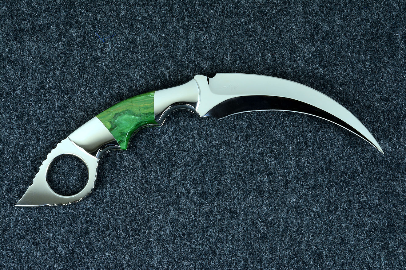 • The steel I chose for this knife is ATS-34 high molybdenum martensitic stainless steel, chosen for its durability and toughness. Because it has high carbon and high molybdenum, this results in profuse molybdenum as well as chromium carbides, and high toughness (resistance to breakage), as well as wear resistance. To bring this steel to its zenith, I used my proprietary T3 deep cryogenic process in heat treating this blade; it's a highly detailed, extremely sophisticated process that takes 33 individual steps and takes over a week long. The result of this is an incredibly wear-resistant blade that has extremely high carbide development, fine grain, and extremely high corrosion resistance. Asperity is reduced; the microstructure development is superior to any other typical handmade knife, and far above any factory or manufactured knife. This is, simply put, ATS-34 at its very finest advanced condition. The convex blade edge grind for this knife blade is hollow, with a very thin and tough cutting edge and an extremely fine point, accomplished with a 3" contact wheel which leaves plenty of thick spine to support the curved blade. Because it's ATS-34, the thin point is resistant to breakage or fracture due to high toughness. The concave blade edge grind is a taper grind, producing a strong and durable edge without sacrificing strength. The blade is mirror polished and I fileworked the knife completely around the spine with a complex vine pattern, including the inside handle curves. The talon at the butt is clean and thick for strength and the finger ring is polished and smooth throughout.