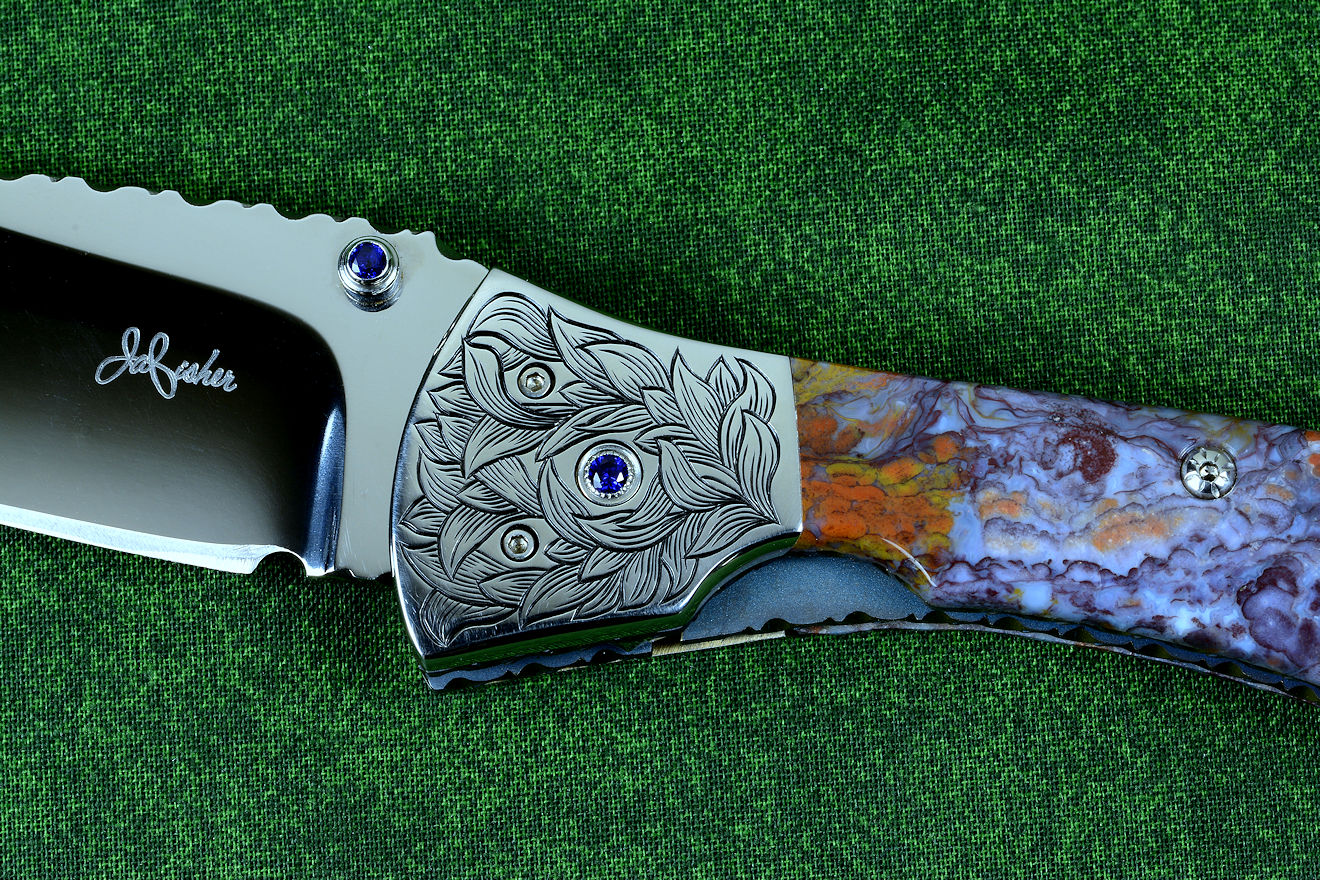 faceted blue amethyst gemstones. I put thumb studs on both sides of the blade